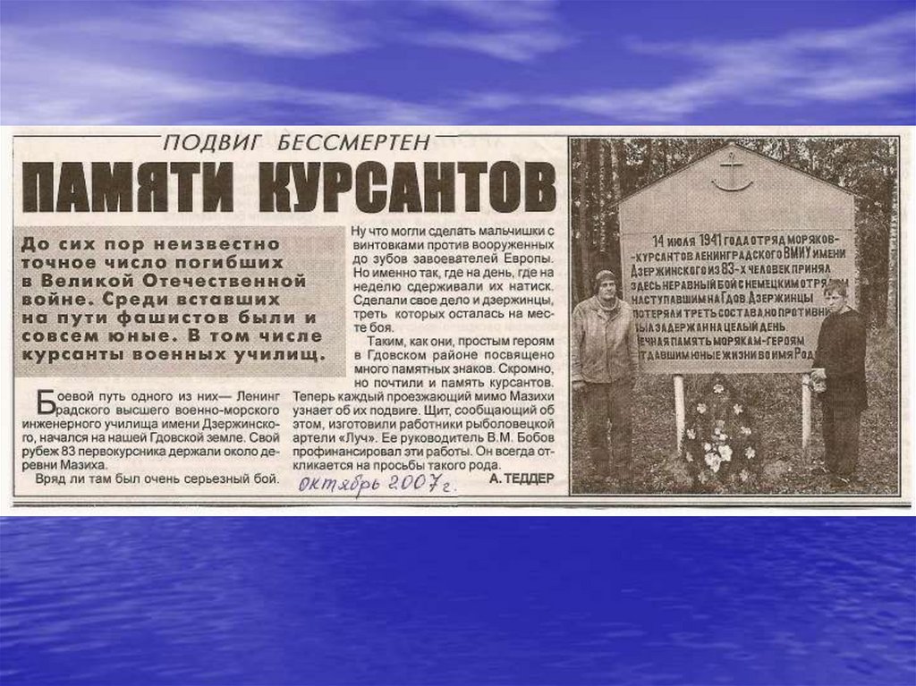 У дороги за деревней Мазиха установлен памятныйзнак, там, где в 1941 году моряки -курсанты