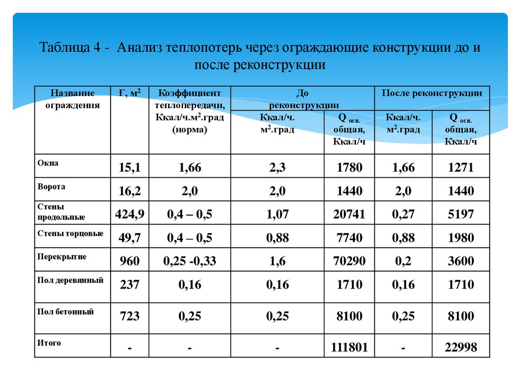 Таблица 4 - Анализ теплопотерь через ограждающие конструкции до ипосле реконструкции