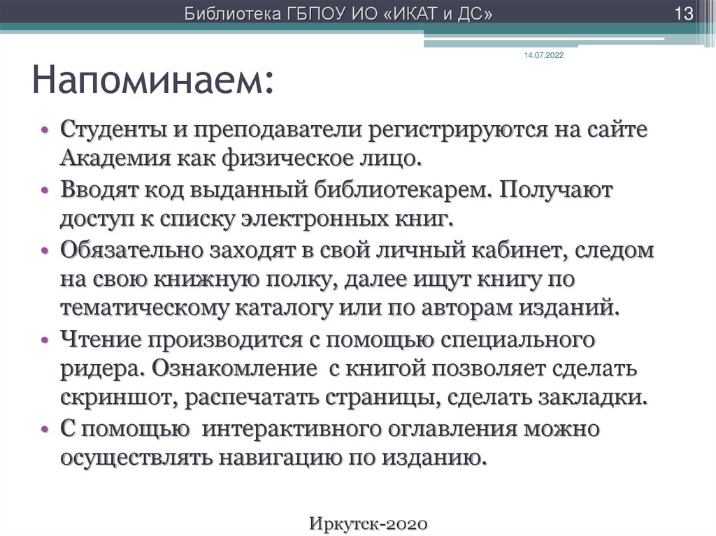 Библиотека ГБПОУ ИО «ИКАТ и ДС»13
