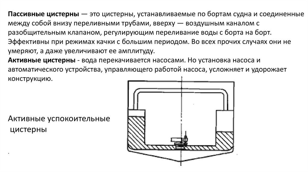 Пассивные цистерны — это цистерны, устанавливаемые по бортам судна и соединенныемежду собой внизу переливными трубами, вверху — воздушным каналом с