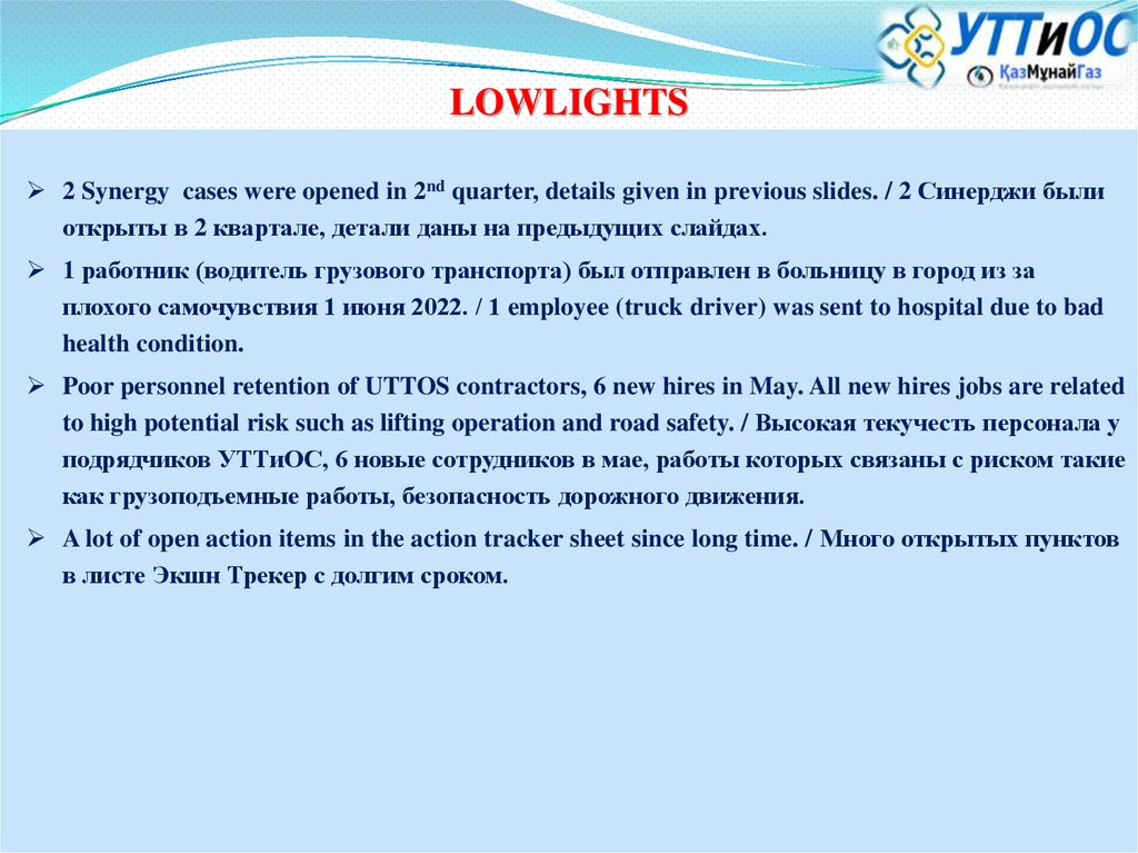 LOWLIGHTS2 Synergy cases were opened in 2nd quarter, details given in previous slides. / 2 Синерджи были