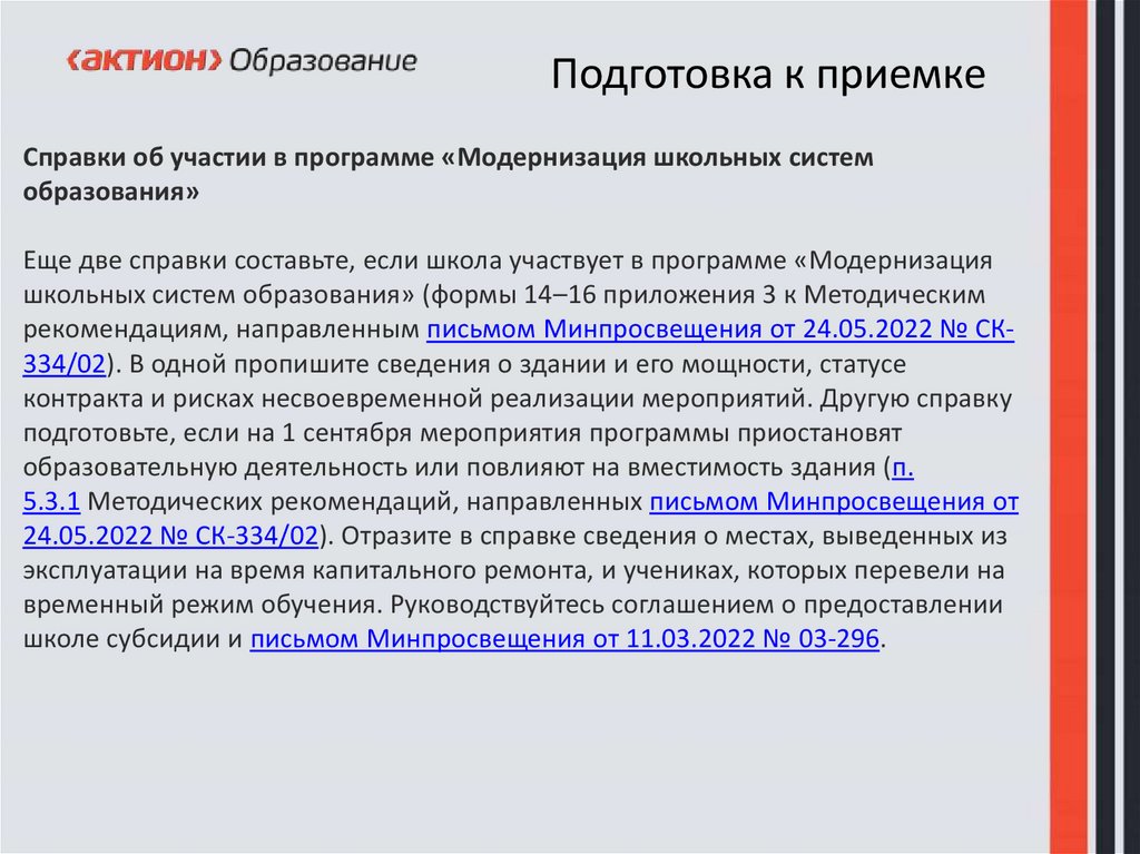 Подготовка к приемкеСправки об участии в программе «Модернизация школьных систем