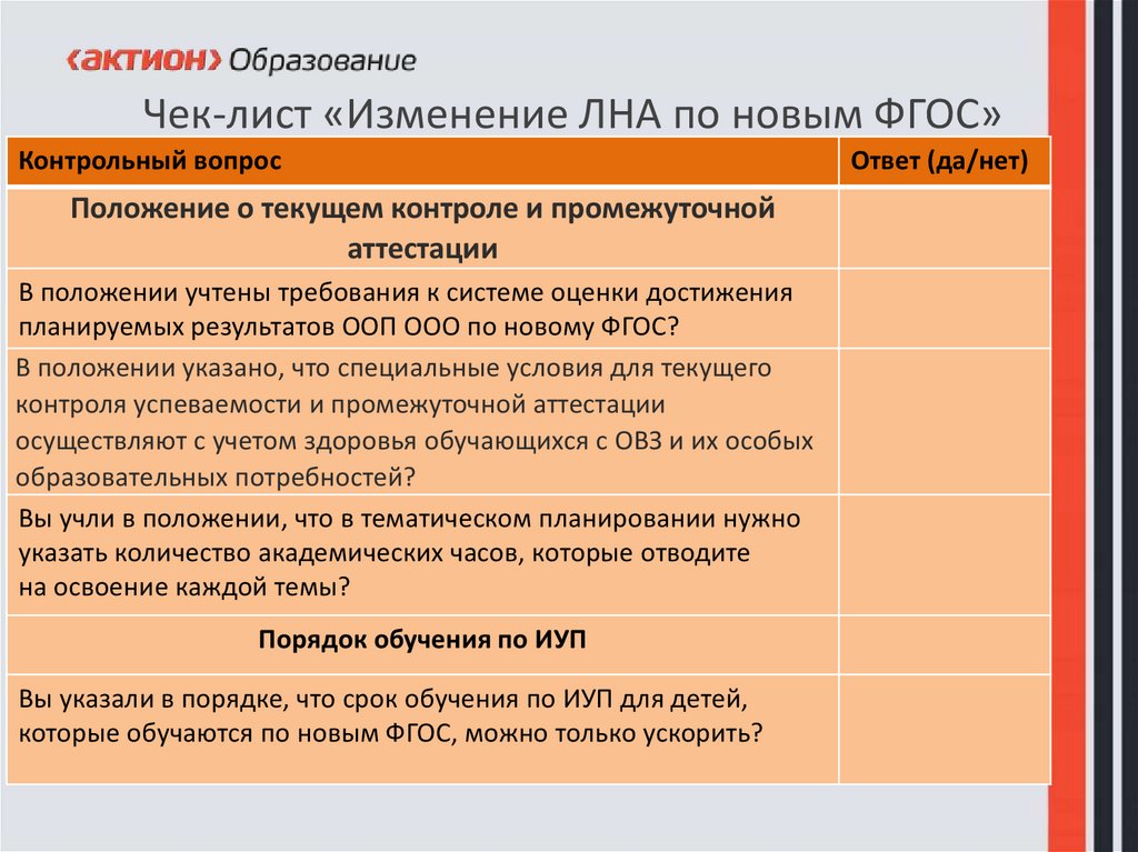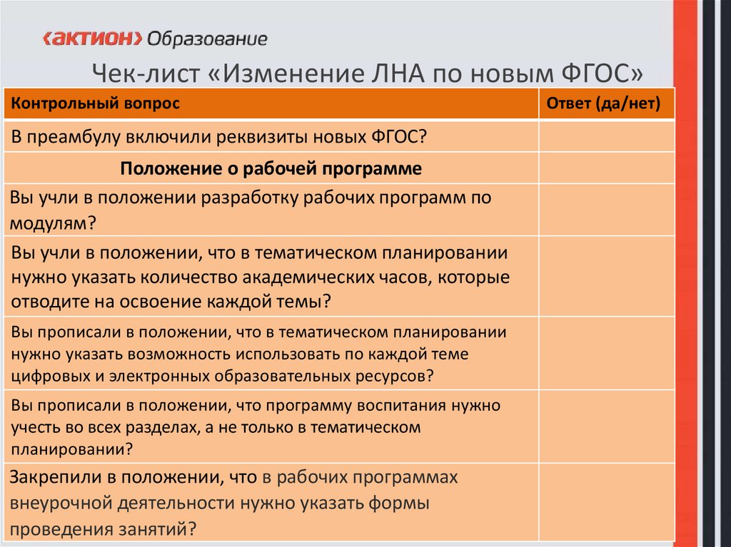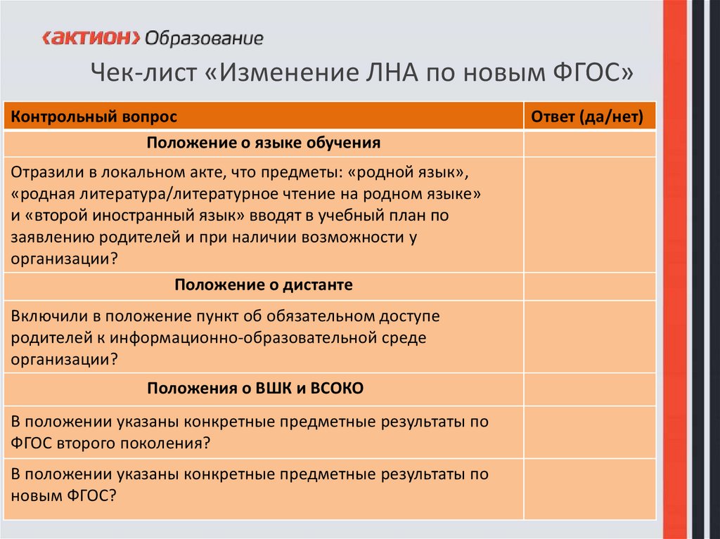Чек-лист «Изменение ЛНА по новым ФГОС»Контрольный вопрос