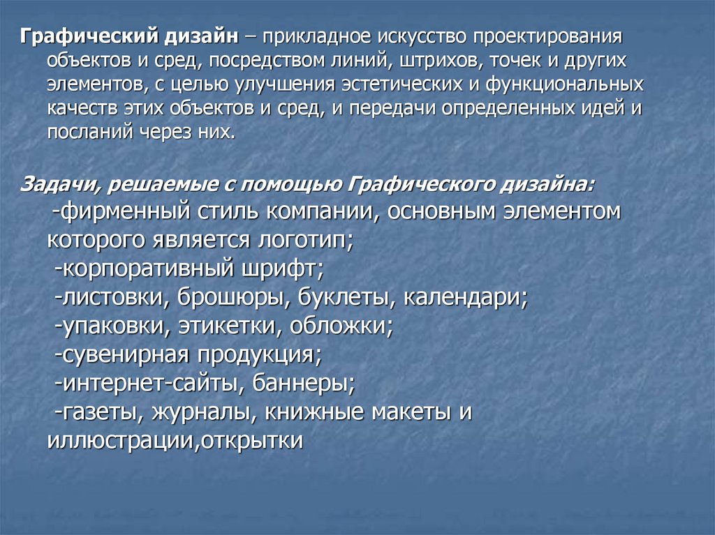 Графический дизайн – прикладное искусство проектированияобъектов и сред, посредством линий, штрихов, точек и других