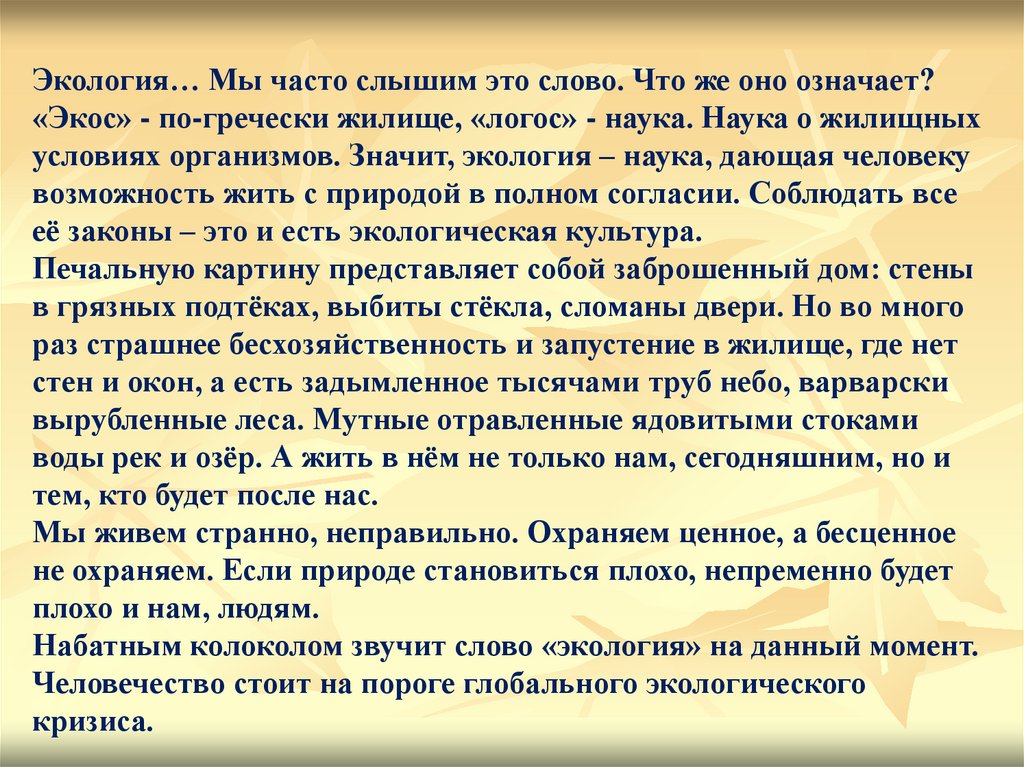 Экология… Мы часто слышим это слово. Что же оно означает?«Экос» - по-гречески жилище, «логос» - наука. Наука о жилищных