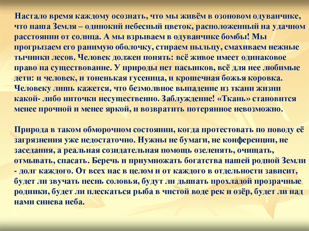 Настало время каждому осознать, что мы живём в озоновом одуванчике,что наша Земля – одинокий небесный цветок, расположенный на удачном