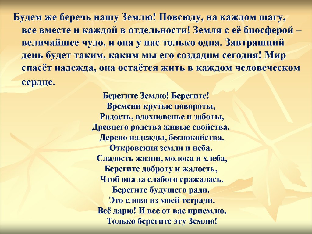 Будем же беречь нашу Землю! Повсюду, на каждом шагу,все вместе и каждой в отдельности! Земля с её биосферой –