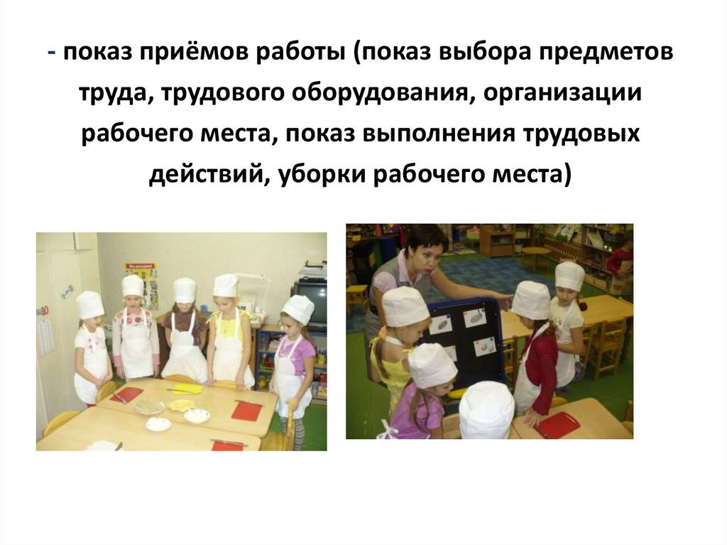 - показ приёмов работы (показ выбора предметовтруда, трудового оборудования, организации