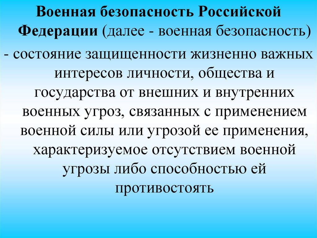 • Защита национальных интересов России ввоенной сфере решается военной