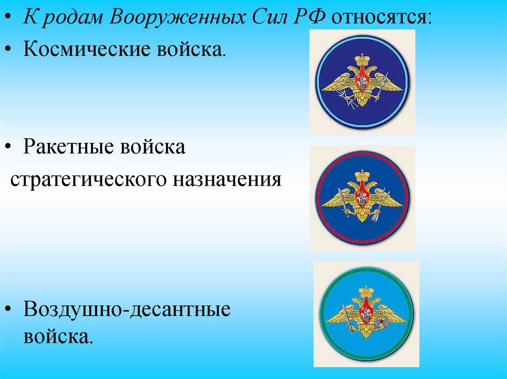 • К родам Вооруженных Сил РФ относятся:• Космические войска.