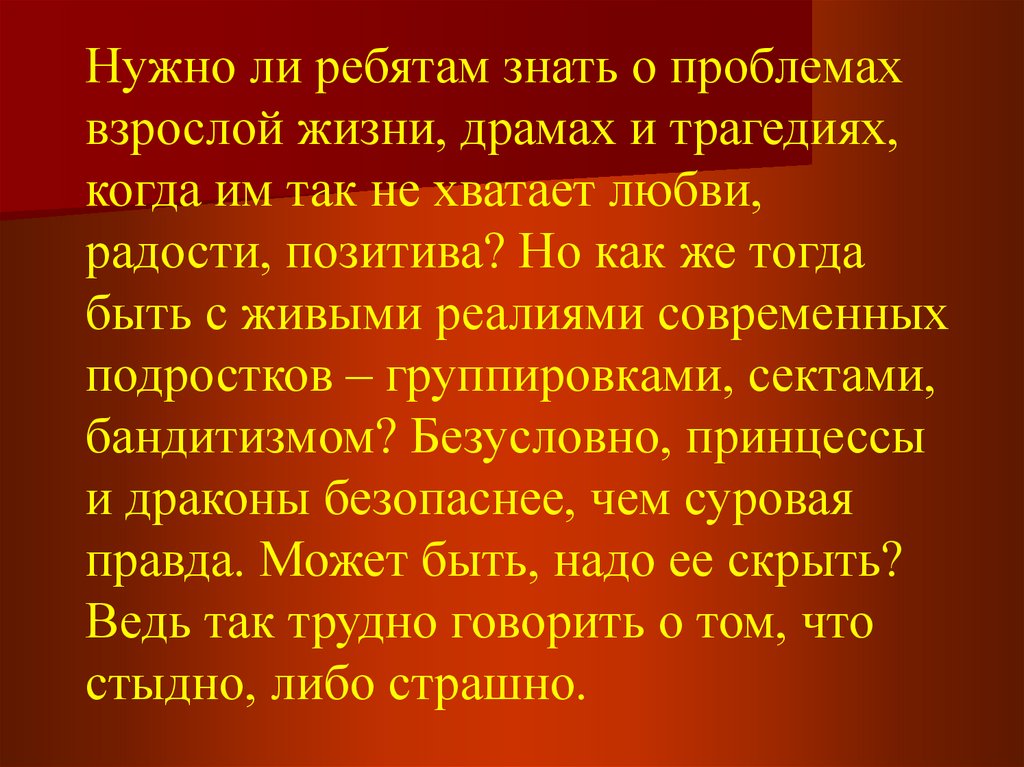 Нужно ли ребятам знать о проблемахвзрослой жизни, драмах и трагедиях,