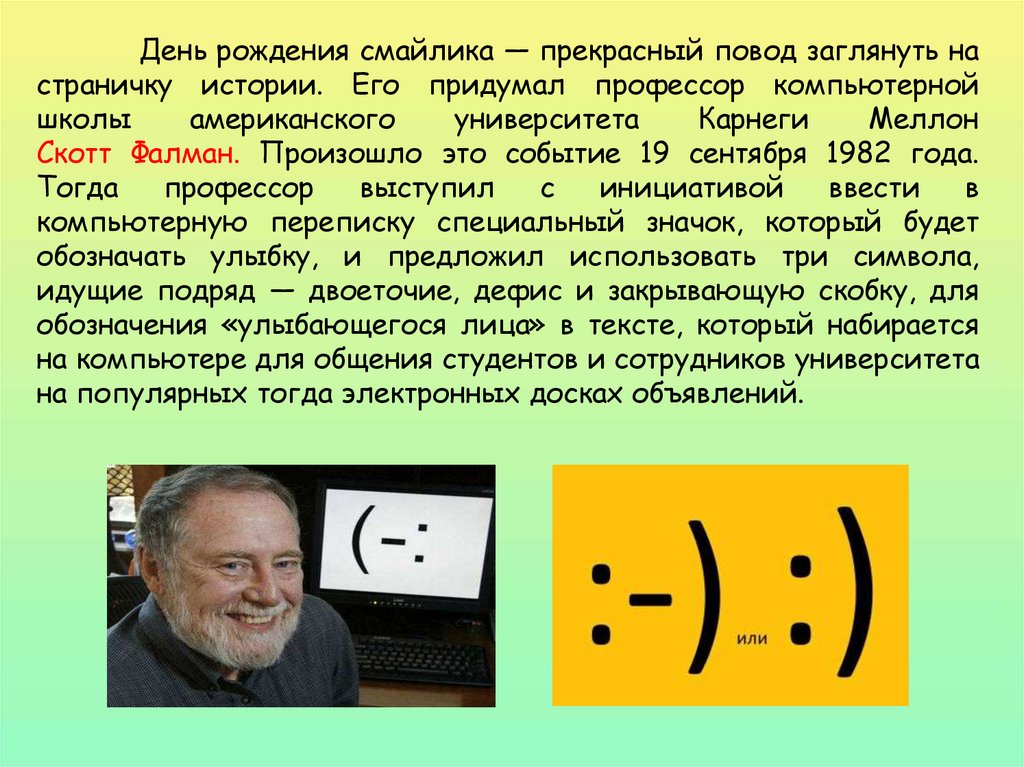 День рождения смайлика — прекрасный повод заглянуть настраничку истории. Его придумал профессор компьютерной