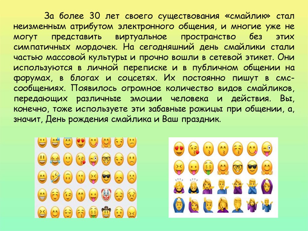 форумах, в блогах и соцсетях. Их постоянно пишут в смссообщениях. Появилось огромное количество видов смайликов,