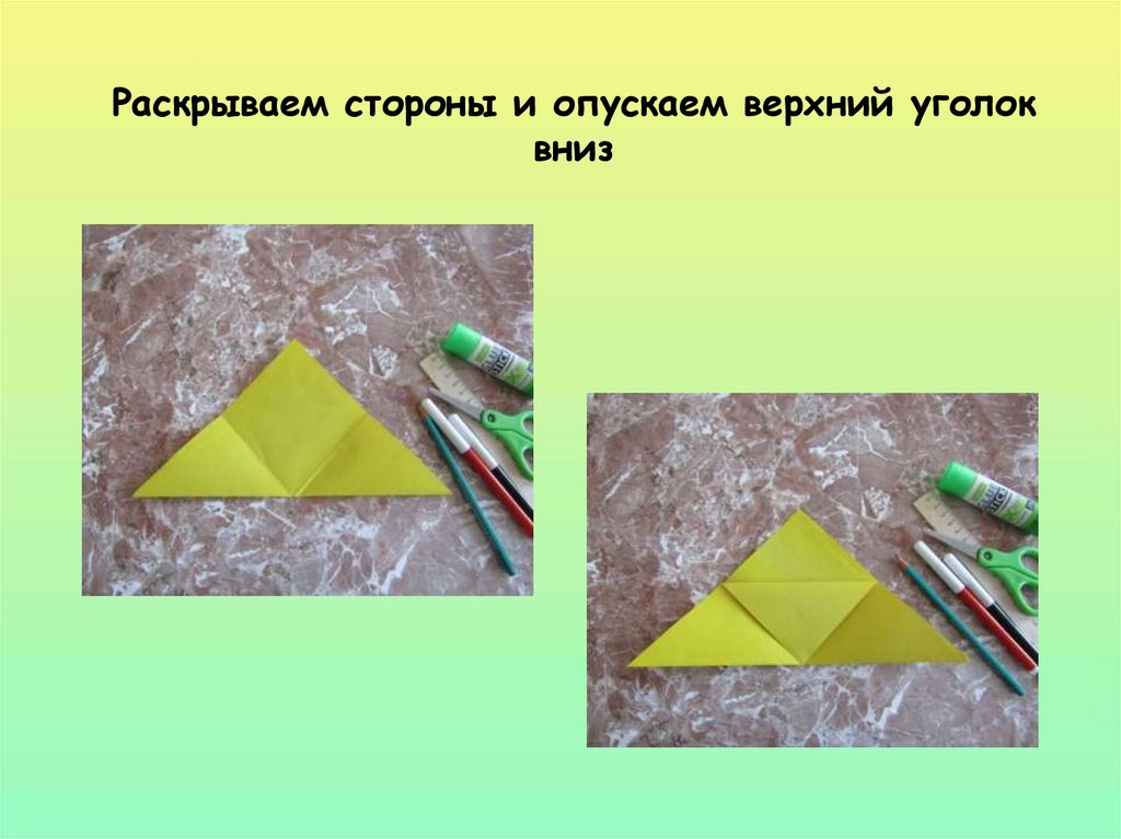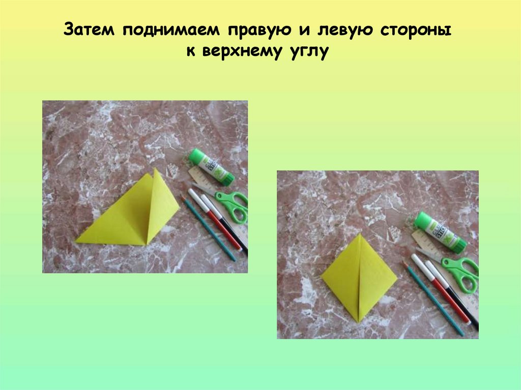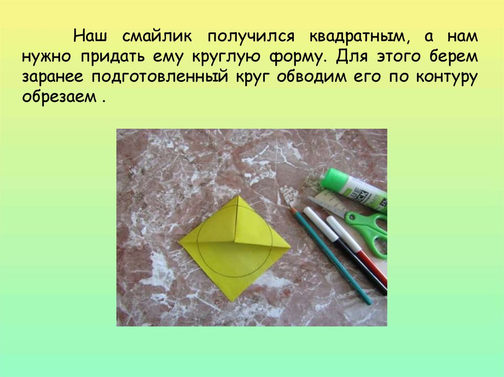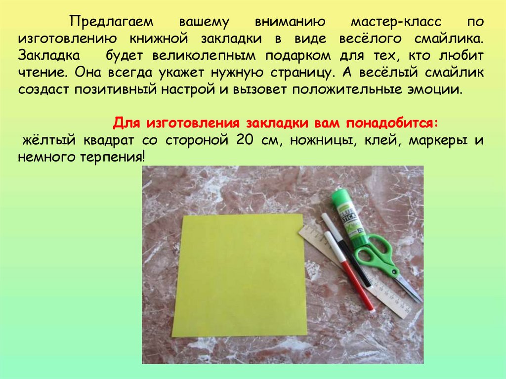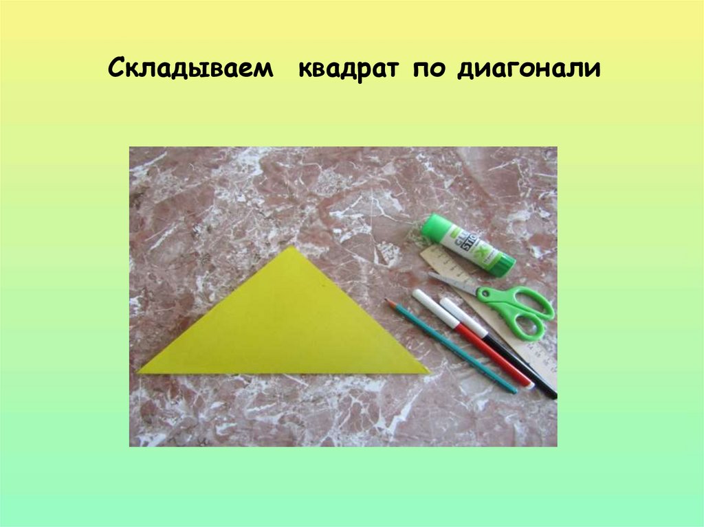 жёлтый квадрат со стороной 20 см, ножницы, клей, маркеры и