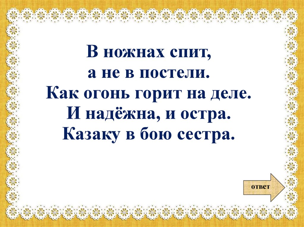 В ножнах спит,а не в постели.