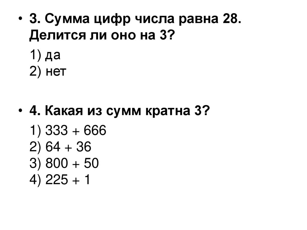 • 3. Сумма цифр числа равна 28.Делится ли оно на 3?