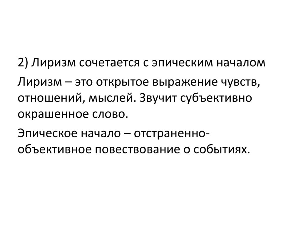 2) Лиризм сочетается с эпическим началомЛиризм – это открытое выражение чувств,
