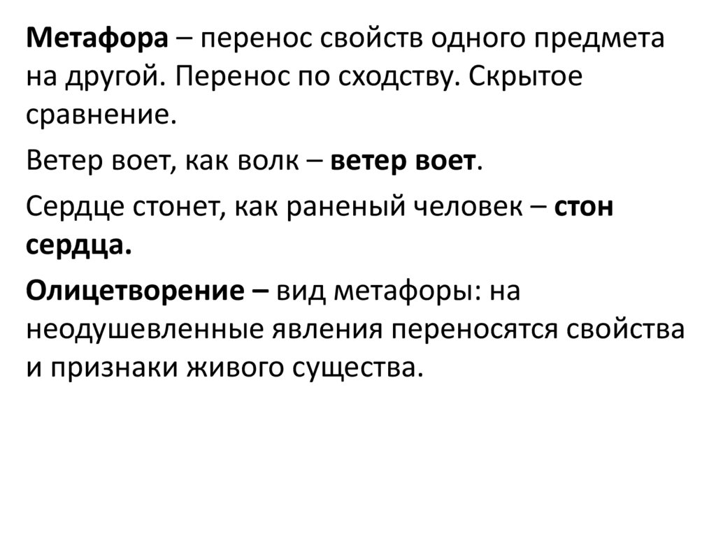 Метафора – перенос свойств одного предметана другой. Перенос по сходству. Скрытое