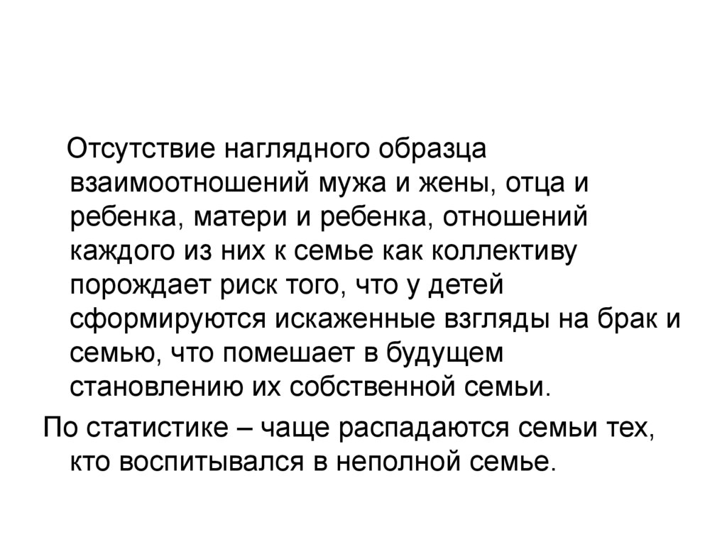 Отсутствие наглядного образцавзаимоотношений мужа и жены, отца и
