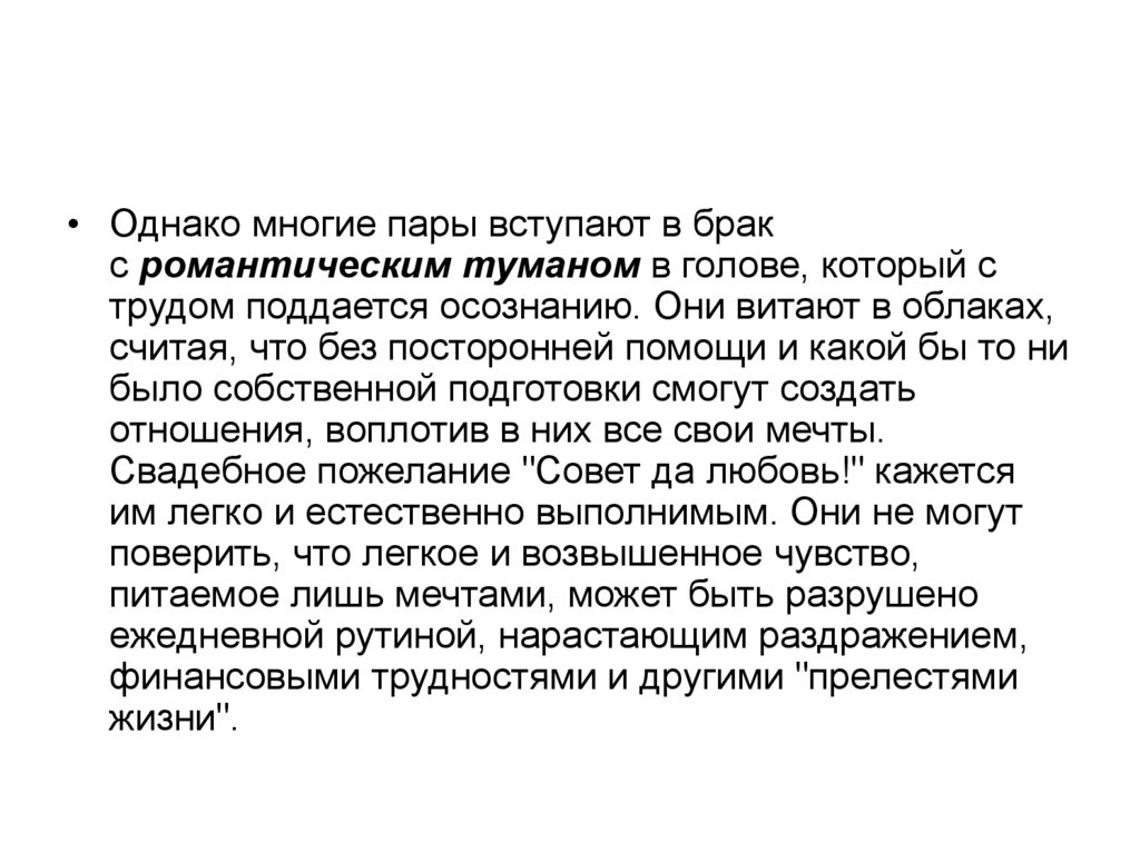 • Однако многие пары вступают в бракс романтическим туманом в голове, который с