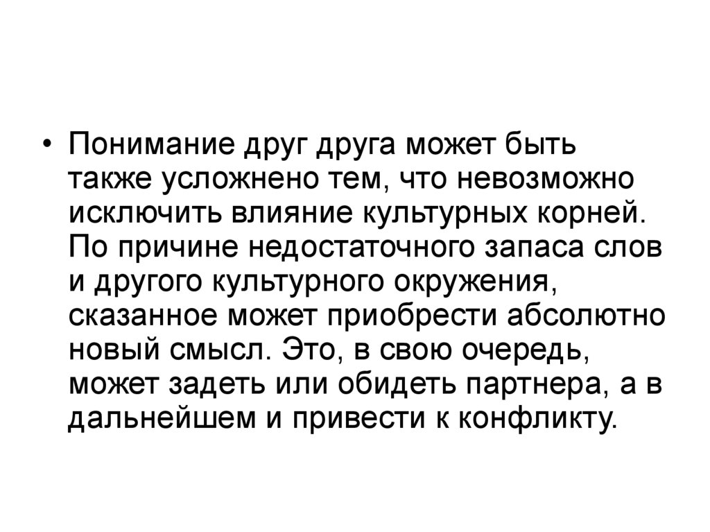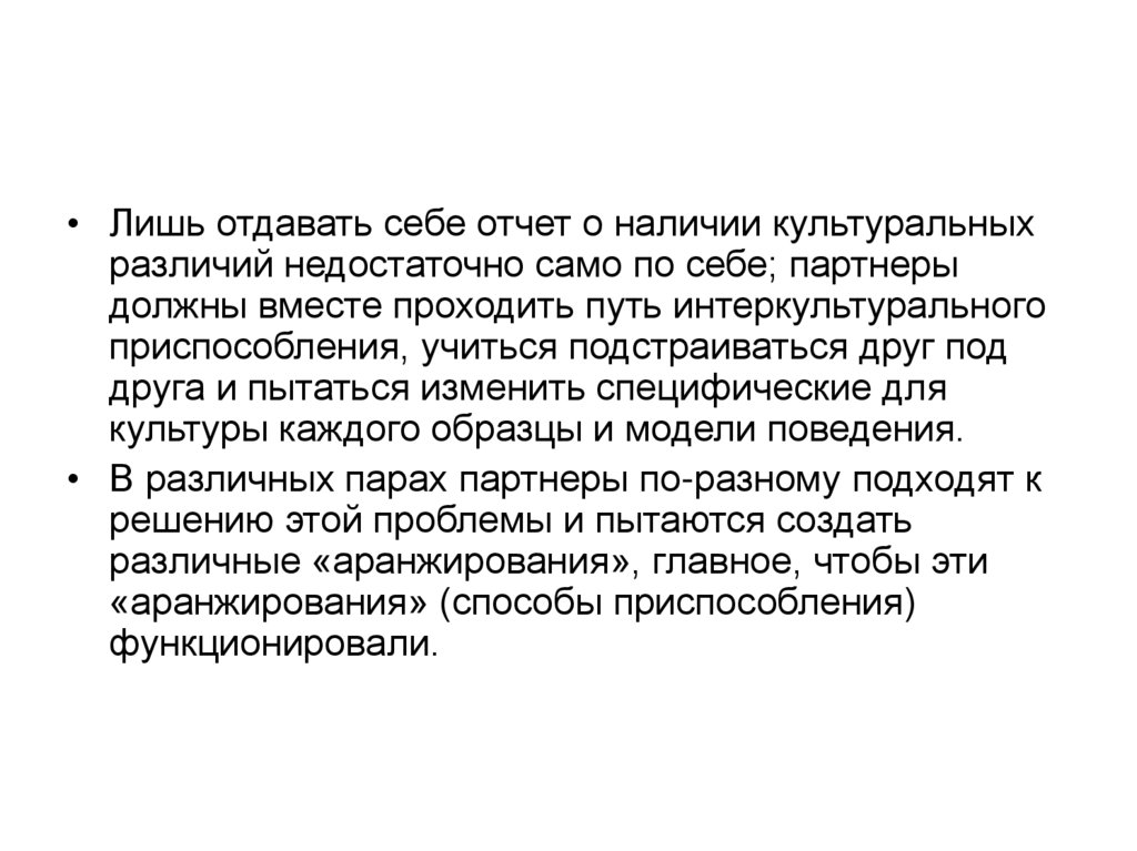 • Лишь отдавать себе отчет о наличии культуральныхразличий недостаточно само по себе; партнеры