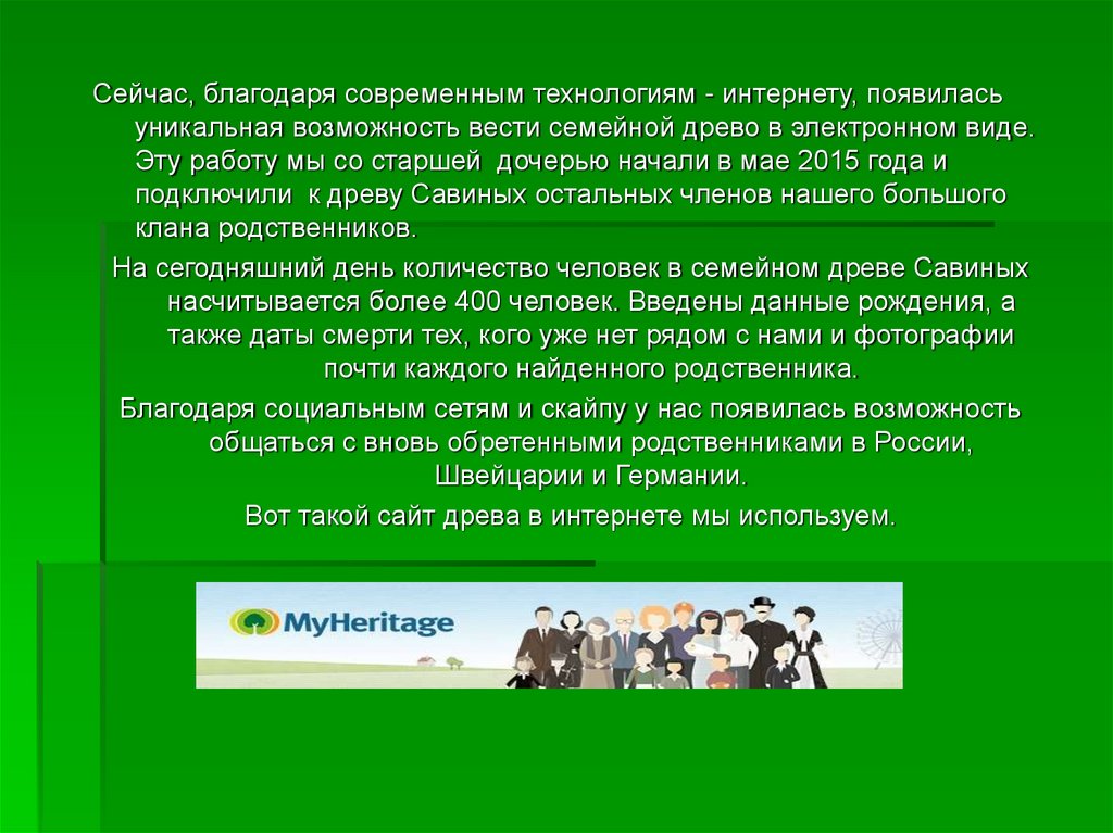 Сейчас, благодаря современным технологиям - интернету, появиласьуникальная возможность вести семейной древо в электронном виде.