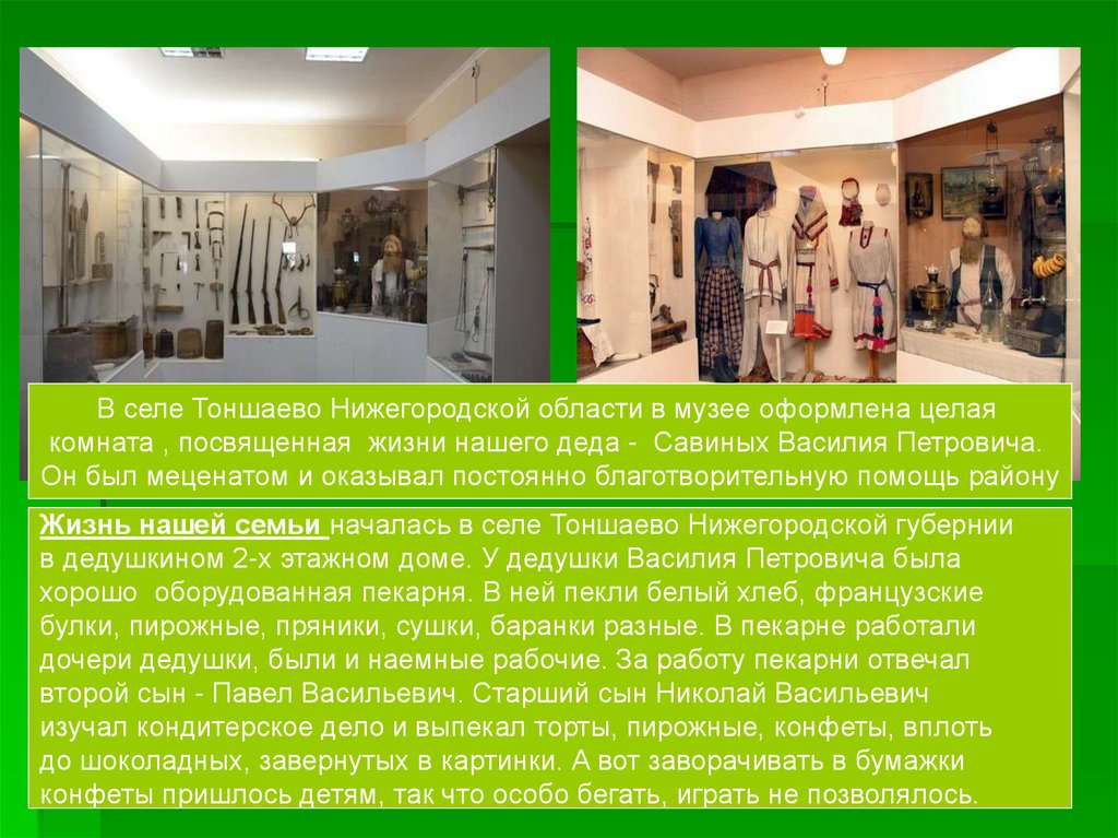 В селе Тоншаево Нижегородской области в музее оформлена целаякомната , посвященная жизни нашего деда - Савиных Василия Петровича.