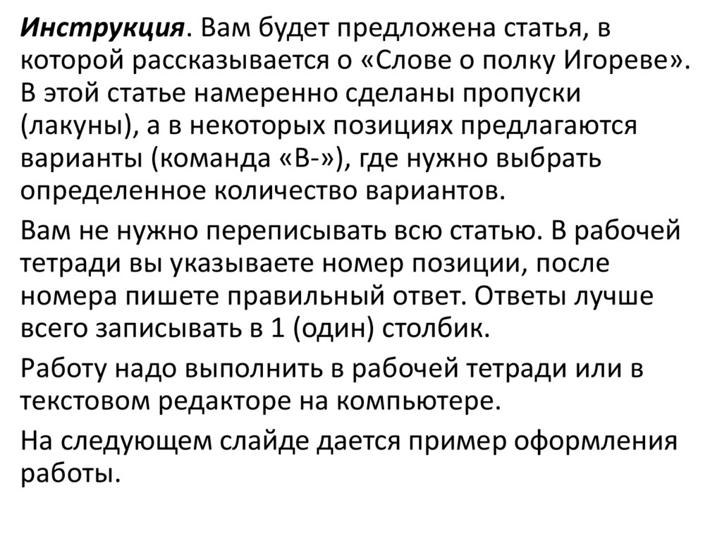 Инструкция. Вам будет предложена статья, вкоторой рассказывается о «Слове о полку Игореве».