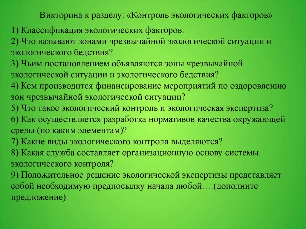 Викторина к разделу: «Контроль экологических факторов»1) Классификация экологических факторов.