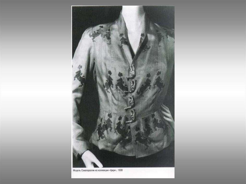 1937----Сюрреалистические мотивы Сальватора Далипуговицы в виде фигур на классических костюмахрыбки, гимнасты .цирковые лошади------Карманы- выдвижные ящики—