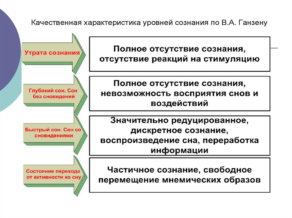 Качественная характеристика уровней сознания по В.А. Ганзену24.