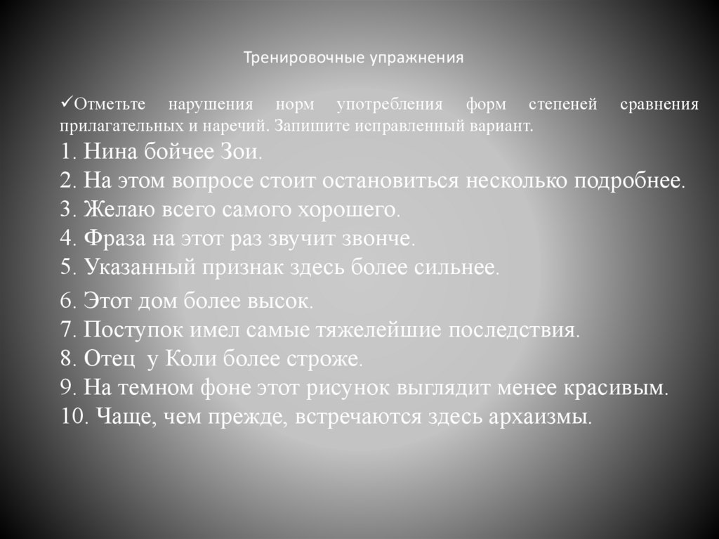 Тренировочные упражненияОтметьте нарушения норм употребления форм степеней