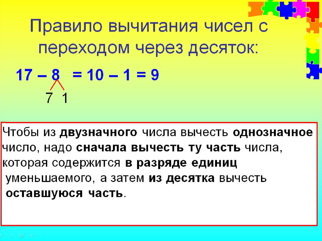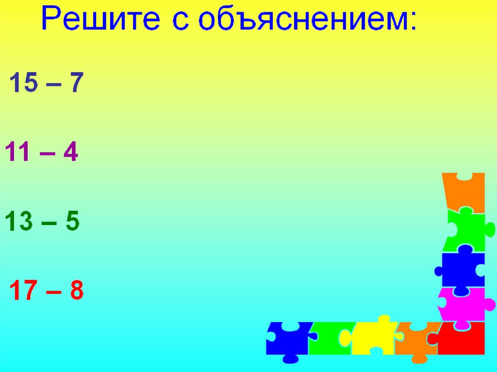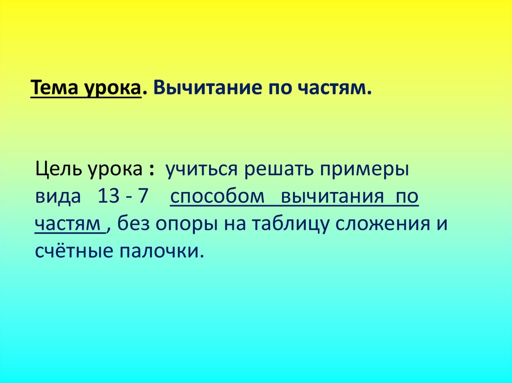 Тема урока. Вычитание по частям.Цель урока : учиться решать примеры