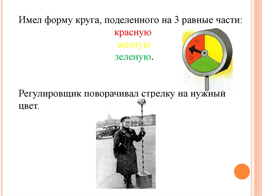 Имел форму круга, поделенного на 3 равные части:красную