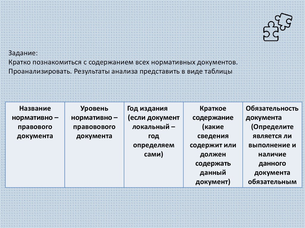 Задание:Кратко познакомиться с содержанием всех нормативных документов.