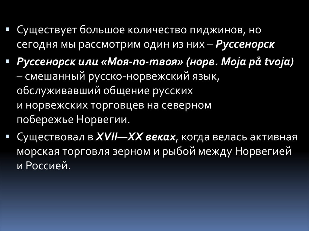 Существует большое количество пиджинов, носегодня мы рассмотрим один из них – Руссенорск