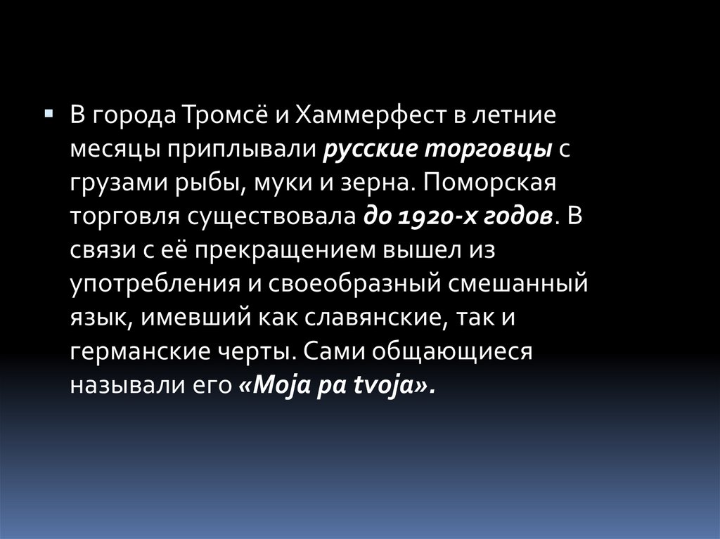 В города Тромсё и Хаммерфест в летниемесяцы приплывали русские торговцы с