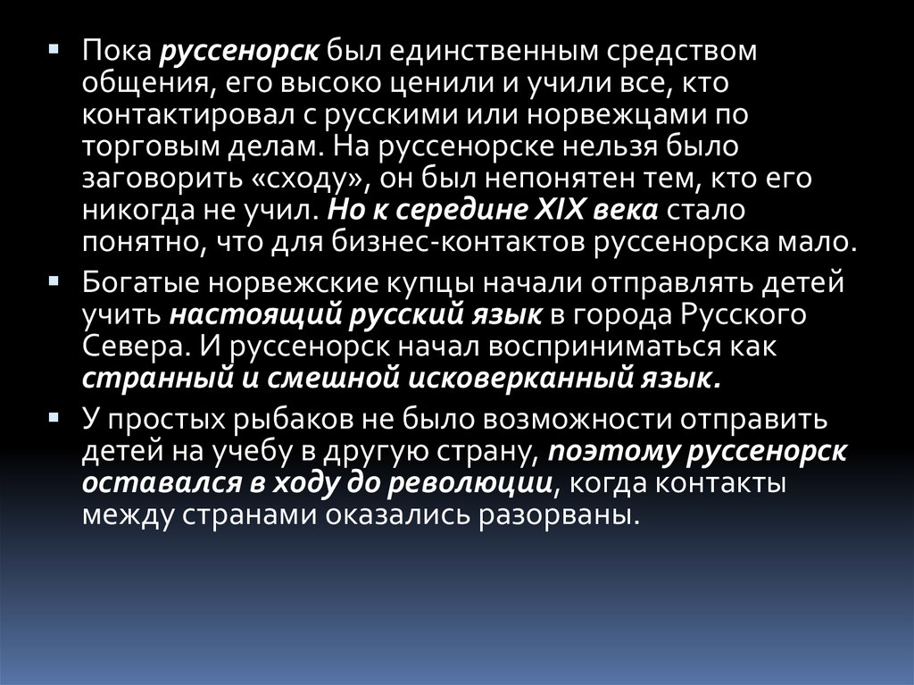 Пока руссенорск был единственным средствомобщения, его высоко ценили и учили все, кто