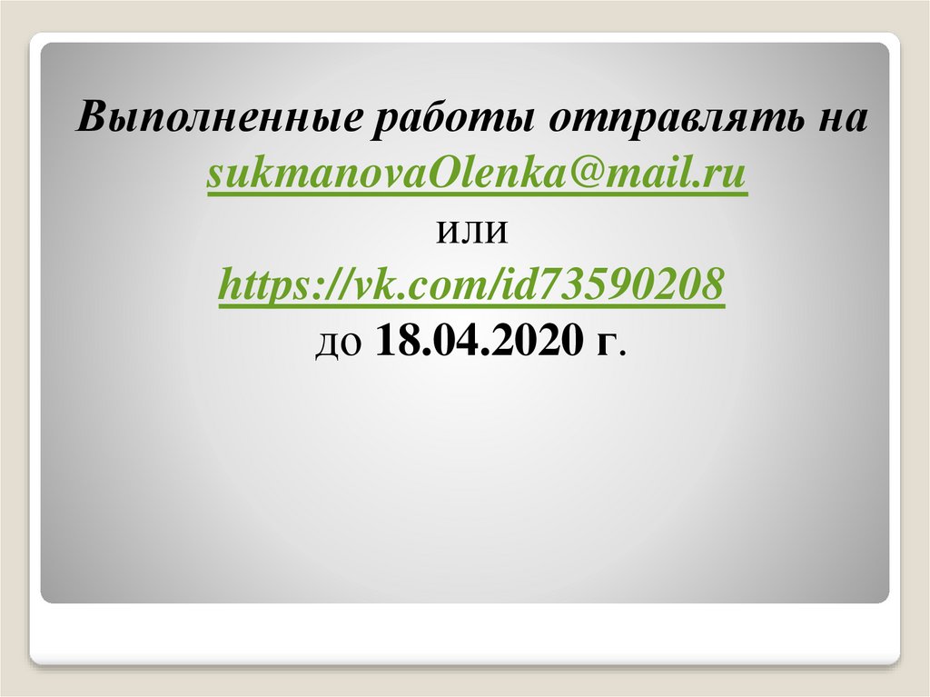 Выполненные работы отправлять наsukmanovaOlenka@mail.ru