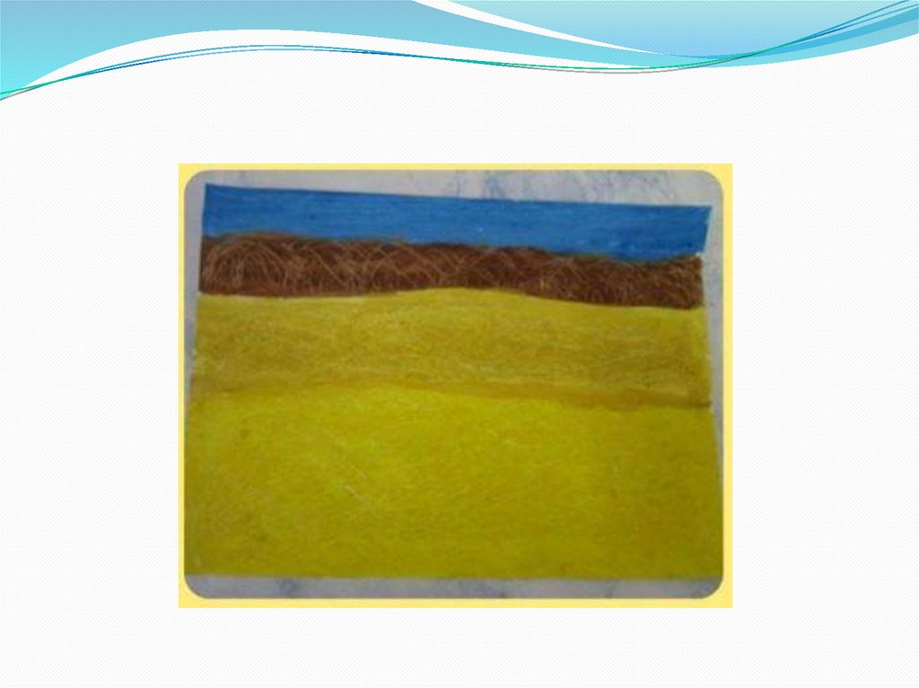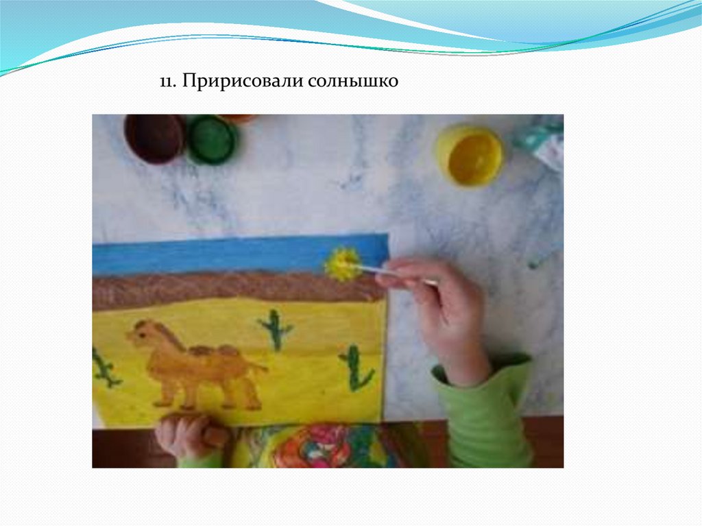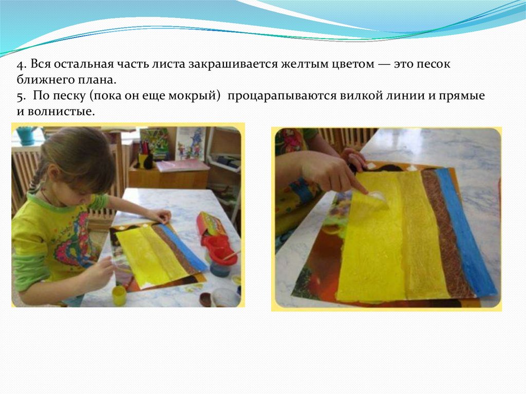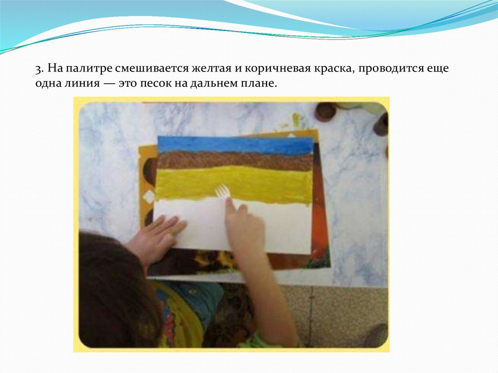 3. На палитре смешивается желтая и коричневая краска, проводится ещеодна линия — это песок на дальнем плане.