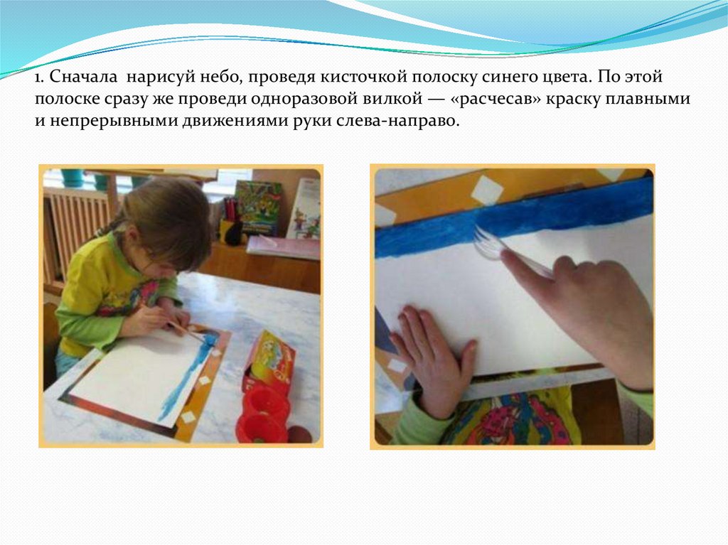 1. Сначала нарисуй небо, проведя кисточкой полоску синего цвета. По этойполоске сразу же проведи одноразовой вилкой — «расчесав» краску плавными