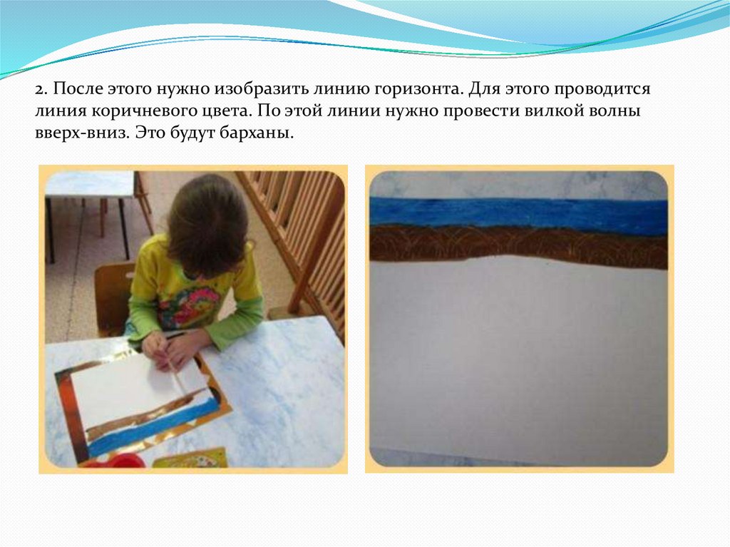 2. После этого нужно изобразить линию горизонта. Для этого проводитсялиния коричневого цвета. По этой линии нужно провести вилкой волны