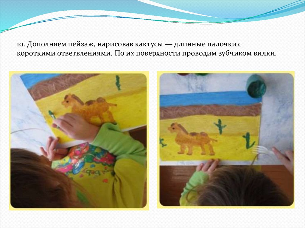 10. Дополняем пейзаж, нарисовав кактусы — длинные палочки скороткими ответвлениями. По их поверхности проводим зубчиком вилки.