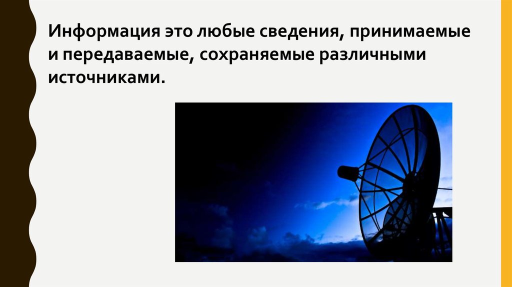 Информация это любые сведения, принимаемыеи передаваемые, сохраняемые различными