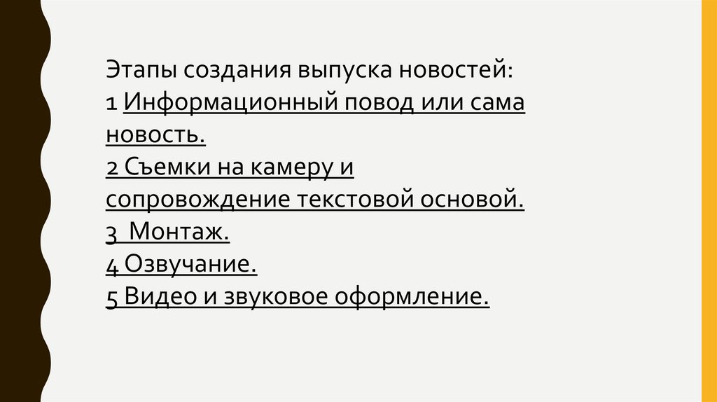 Этапы создания выпуска новостей:1 Информационный повод или сама
