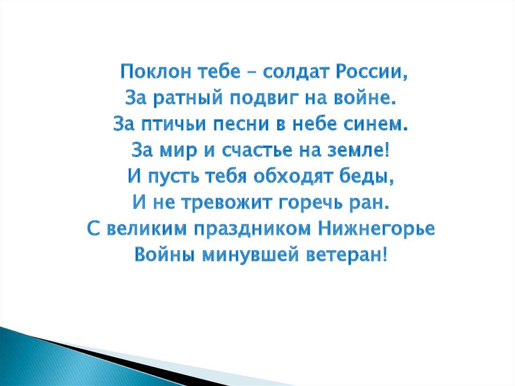 Поклон тебе – солдат России,За ратный подвиг на войне.