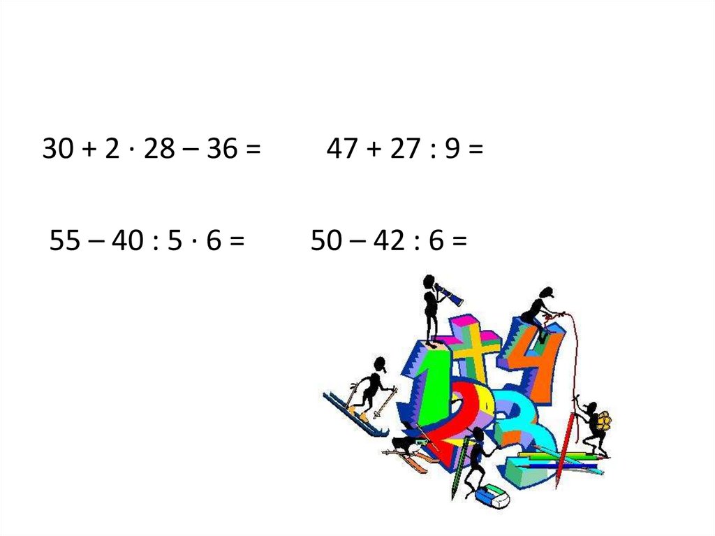 30 + 2 · 28 – 36 =55 – 40 : 5 · 6 =