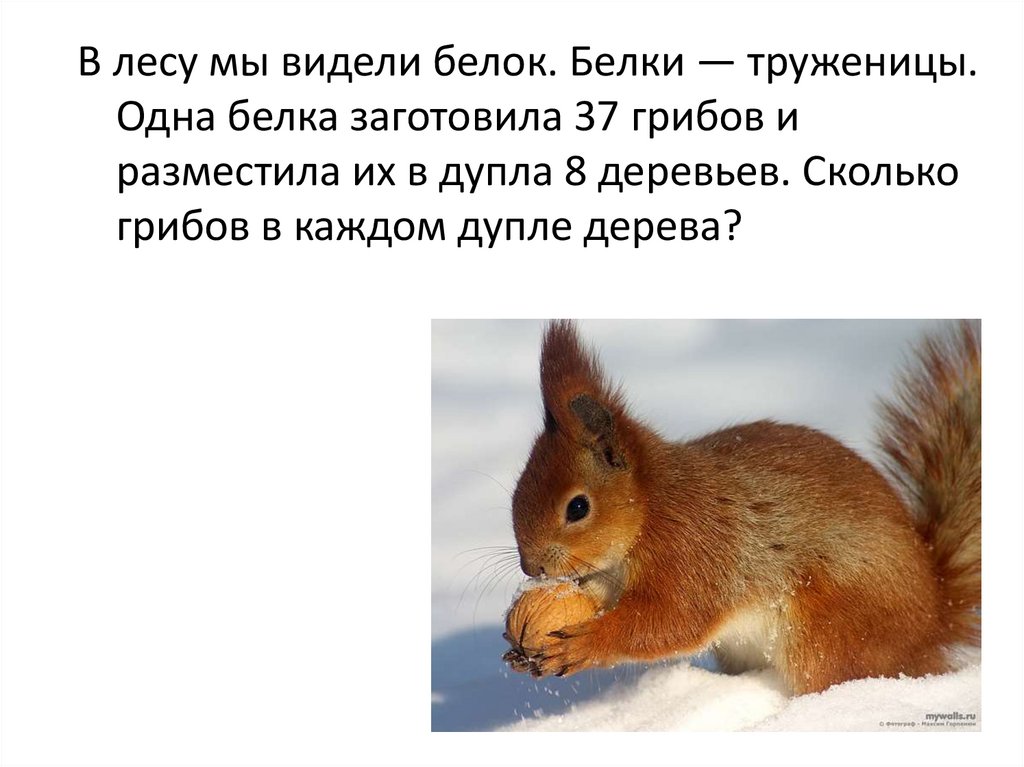 В лесу мы видели белок. Белки — труженицы.Одна белка заготовила 37 грибов и