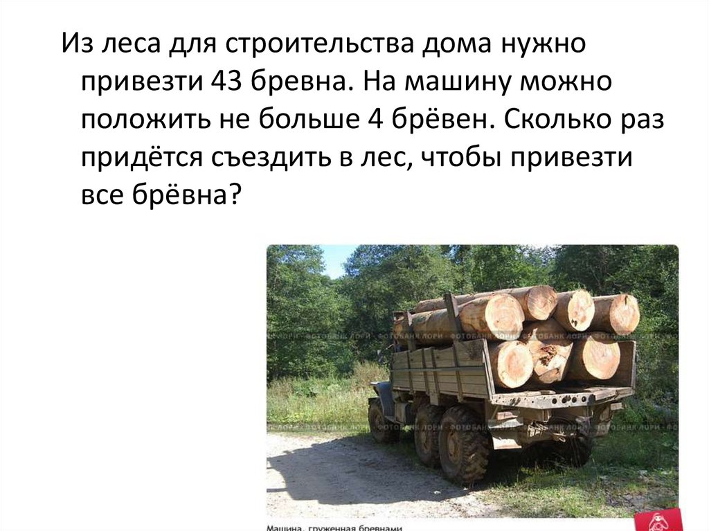 Из леса для строительства дома нужнопривезти 43 бревна. На машину можно