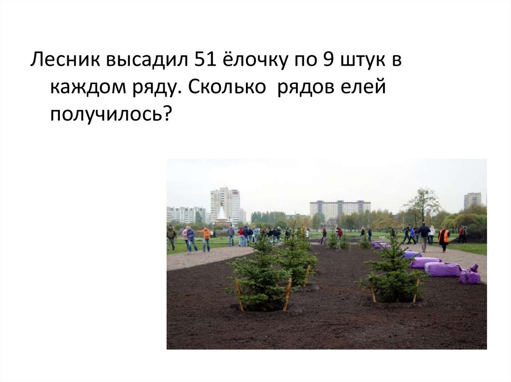 Лесник высадил 51 ёлочку по 9 штук вкаждом ряду. Сколько рядов елей